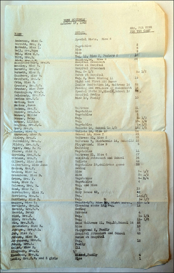 (Above) Camp Hay Duty Roster with Natalie (28 hours) and June (18 hours) listed. Courtesy of the Schlesinger Library and the Crouter Family.